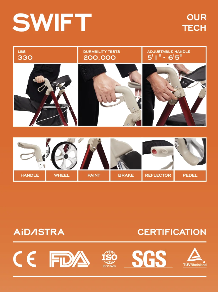 Your safety is our top priority. The Swift Rollator is fully FDA-compliant, meeting rigorous standards for biocompatibility and flame resistance. Every unit undergoes 200,000+ stress tests, so you can rely on it for daily support and long-term durability.